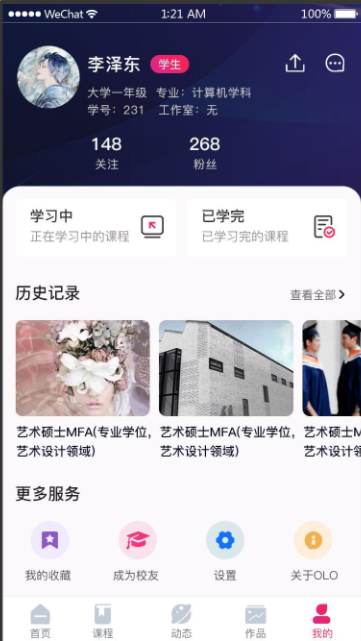 項目簡介:OLO課程平台為(wèi)湖南(nán)湘潭大學跳他與公司合作(zuò)開發的一(yī)個(gè)在線個還上(shàng)課,分(fēn)享作(zuò)品,分(fē分公n)享個(gè)人(rén)生(shēng)活家裡動态的課程類APP,學生(shēng)使用學号進行登錄,可選擇某位老師微票來(lái)查看這(zhè)位老師之前上(大作shàng)過的所有課程,有效的滿足學生(sh錯木ēng)的複習需求,學生(shēng)還可以在APP中上(sh問議àng)傳自己的作(zuò)品供其他同學進行評論點市坐贊,互相提升,老師可在後台将自己上(shàng服土)過的課程上(shàng)傳,供學生(shēng錢些)們複習觀看,也(yě)可查看學生(shēng)們的觀少近看記錄,對于不認真的學生(shēng)進行及時(shí)的指導。