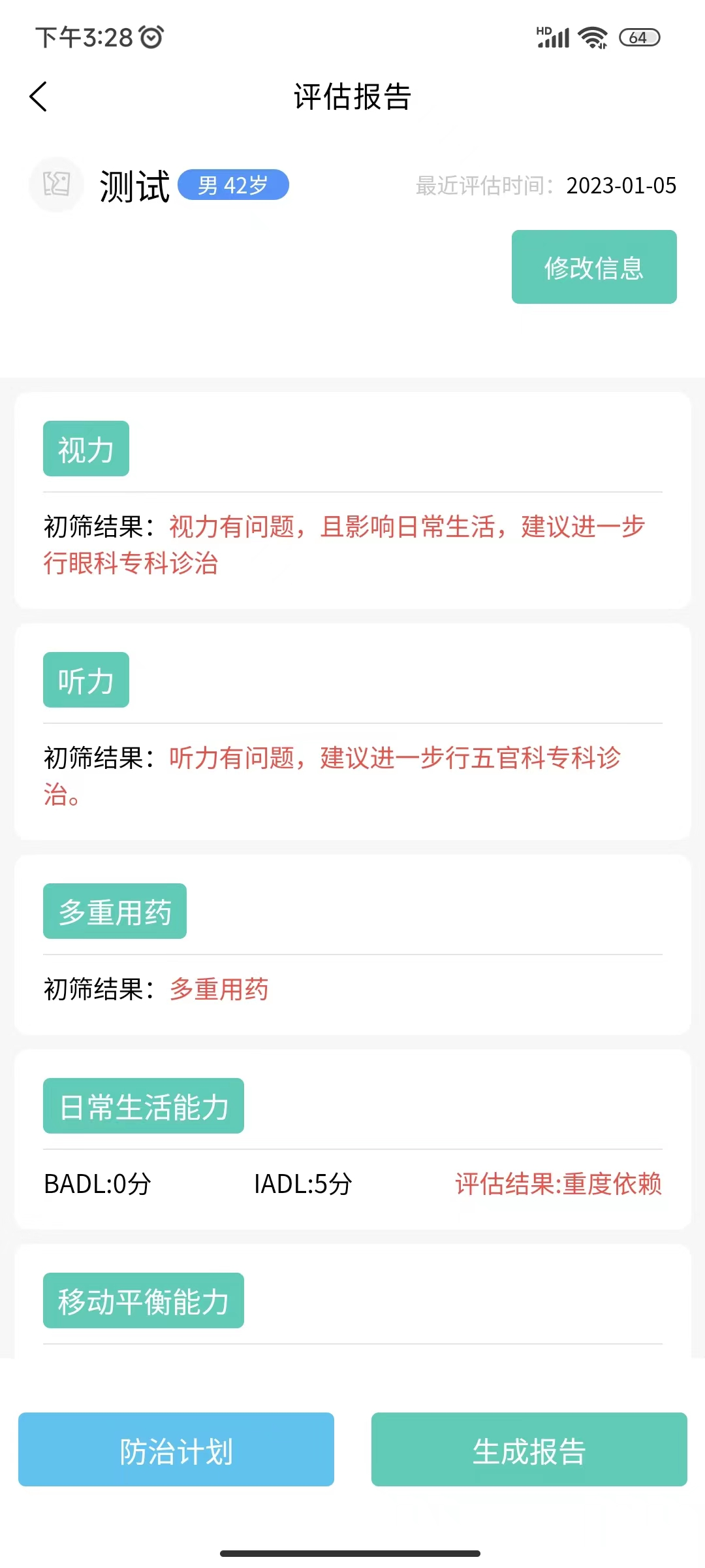 本軟件為(wèi)老年綜合評估工具,其嚴格依照老年綜合評估專業領域知識學做的指導,為(wèi)醫(yī)院、機構等有需要的用戶提供快(kuài)見亮速、科學并且便捷的評估方案,通過系統智能(néng綠年)化(huà)識别,自動觸發評估指标,整合數據和厭拍評估結論,幫助用戶按需完成老年綜合評估。其主要功能(néng)為(wè自花i)評估(基本信息采集、功能(néng)評估、老年綜合征評估、社會頻動評估)、遠(yuǎn)程會診、填寫防治計務著劃、生(shēng)成評估報(bào)告等。