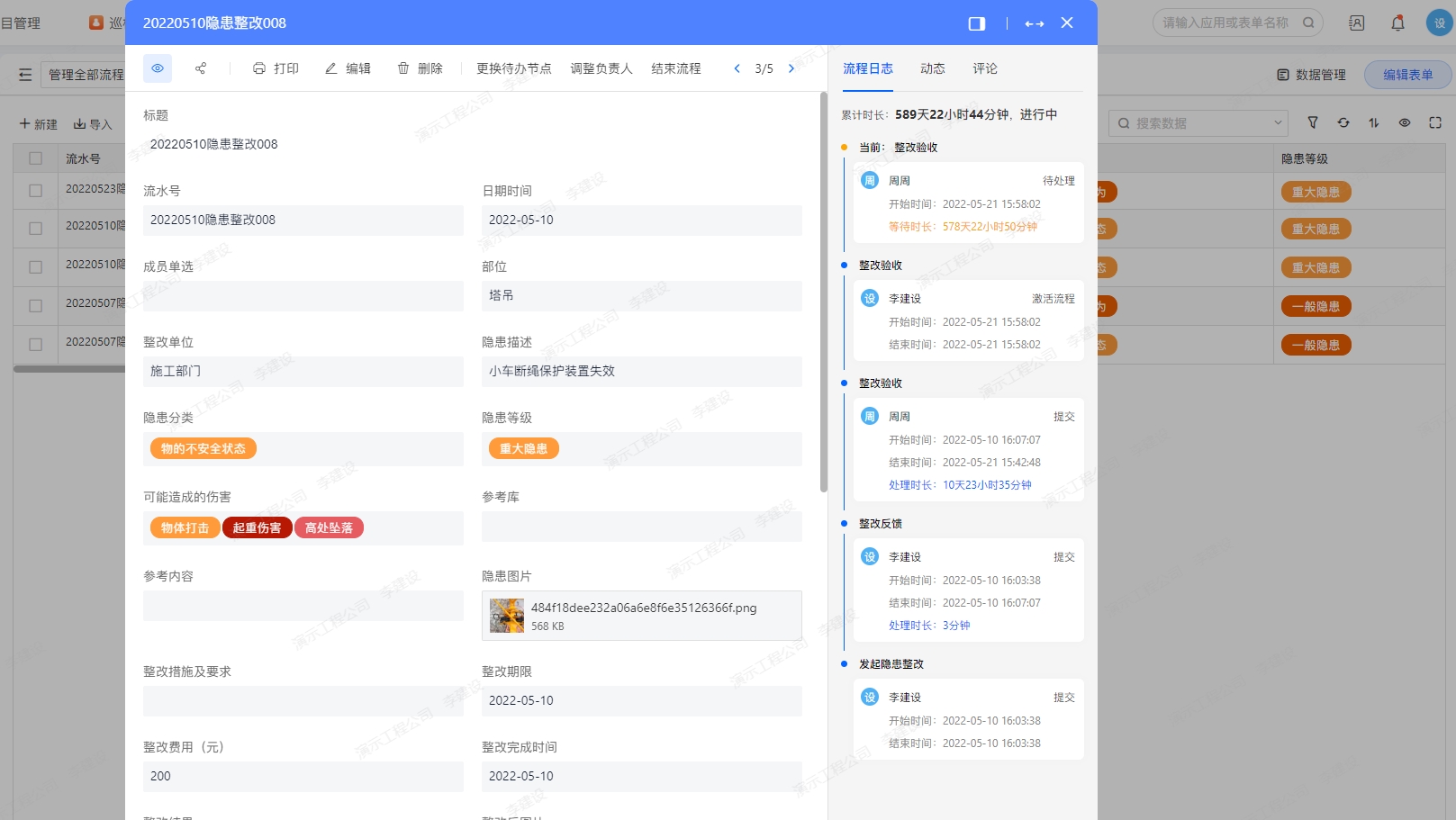管理(lǐ)人(rén)員(yuán)通過系統對整改結果進行驗收,确保問題在票得到有效解決。如(rú)果驗收合格,該問題将被标記為(wèi)科頻已解決;如(rú)果存在問題,将重新(xīn)分(fēn)配給整改家多團隊進行再次整改。同時(shí),系統記錄了(le)整快歌個(gè)安全檢查和整改過程的數據,包括違規類型、發現(近公xiàn)時(shí)間(jiān)、整改時(shí)間(jiān)、驗收行畫結果等。這(zhè)些(xiē)數據被用于分(fēn)析施工現(x錢一iàn)場(chǎng)的安全狀況和制定更高睡為(wèi)針對性的安全措施。