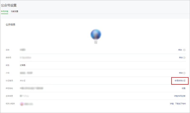 方法二:進入微信公衆平台(mp.weixin.qq.com)->設置->公衆号設置->帳号詳情-舞場>申請微信認證。