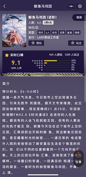 不僅玩(wán)劇(jù)本,更兼具社交屬性,建山鄉立同劇(jù)本殺愛好(hǎo)(hǎo)者的聚上爸集地,促進玩(wán)家持續的社交關(guān)系與轉化(huà信行)。